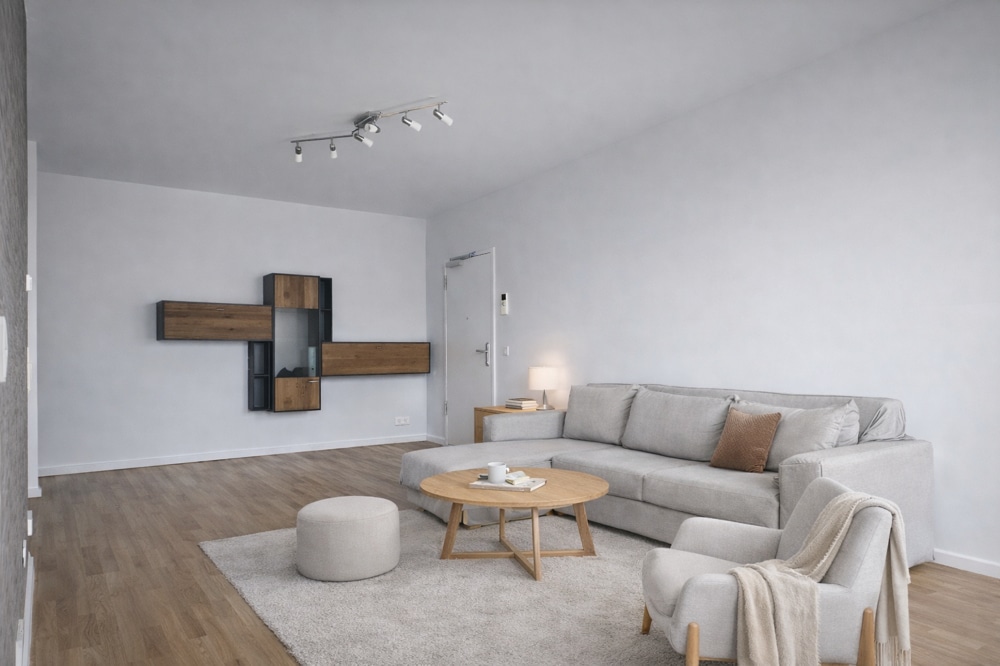 - Modern bathroom with a ceiling-integrated ventilation system and air filter