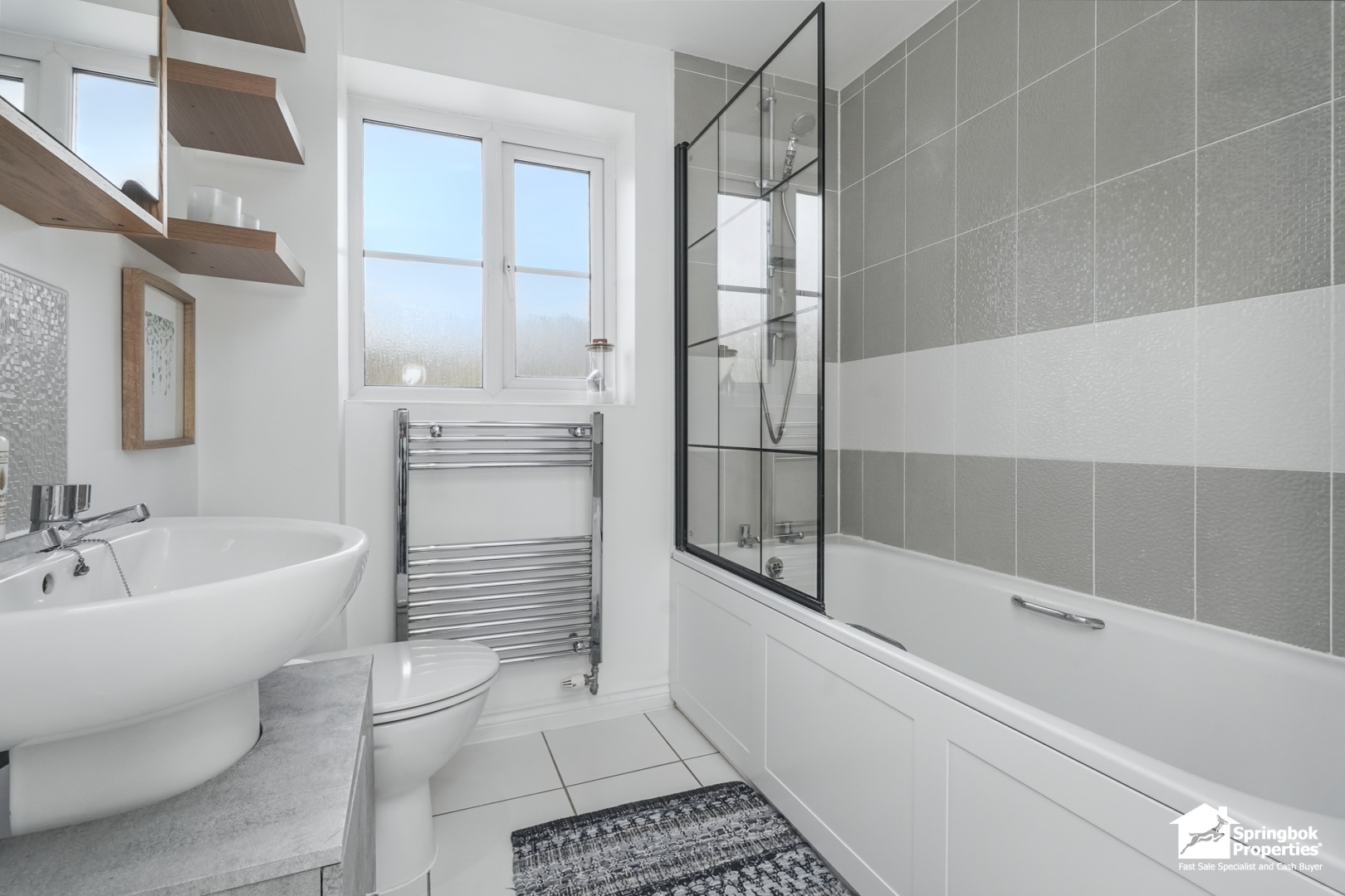 - Stylish bathroom with bath, shower, and chrome towel rail