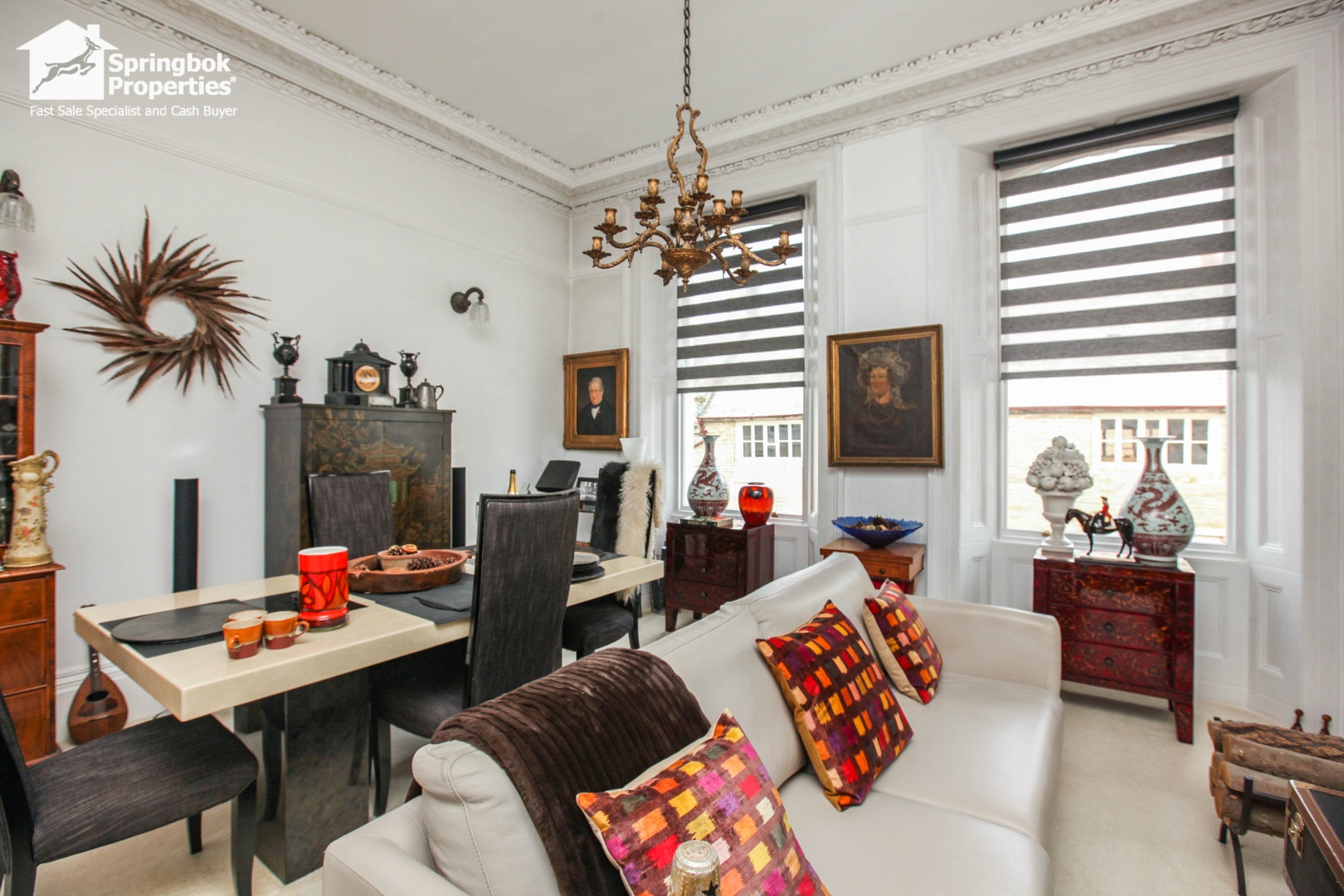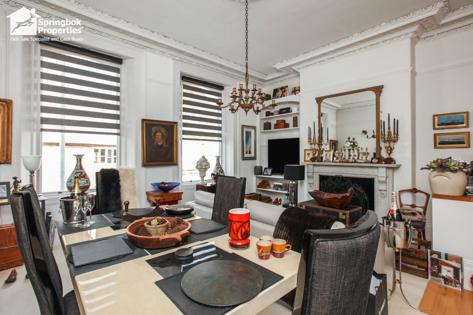 - Period detailing including decorative cornicing and feature fireplace