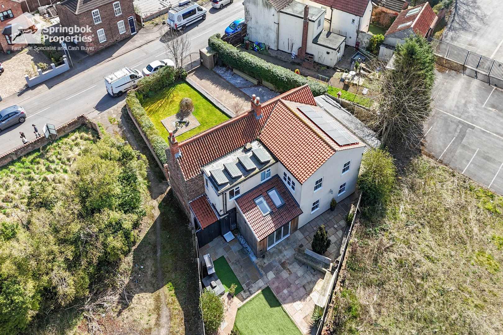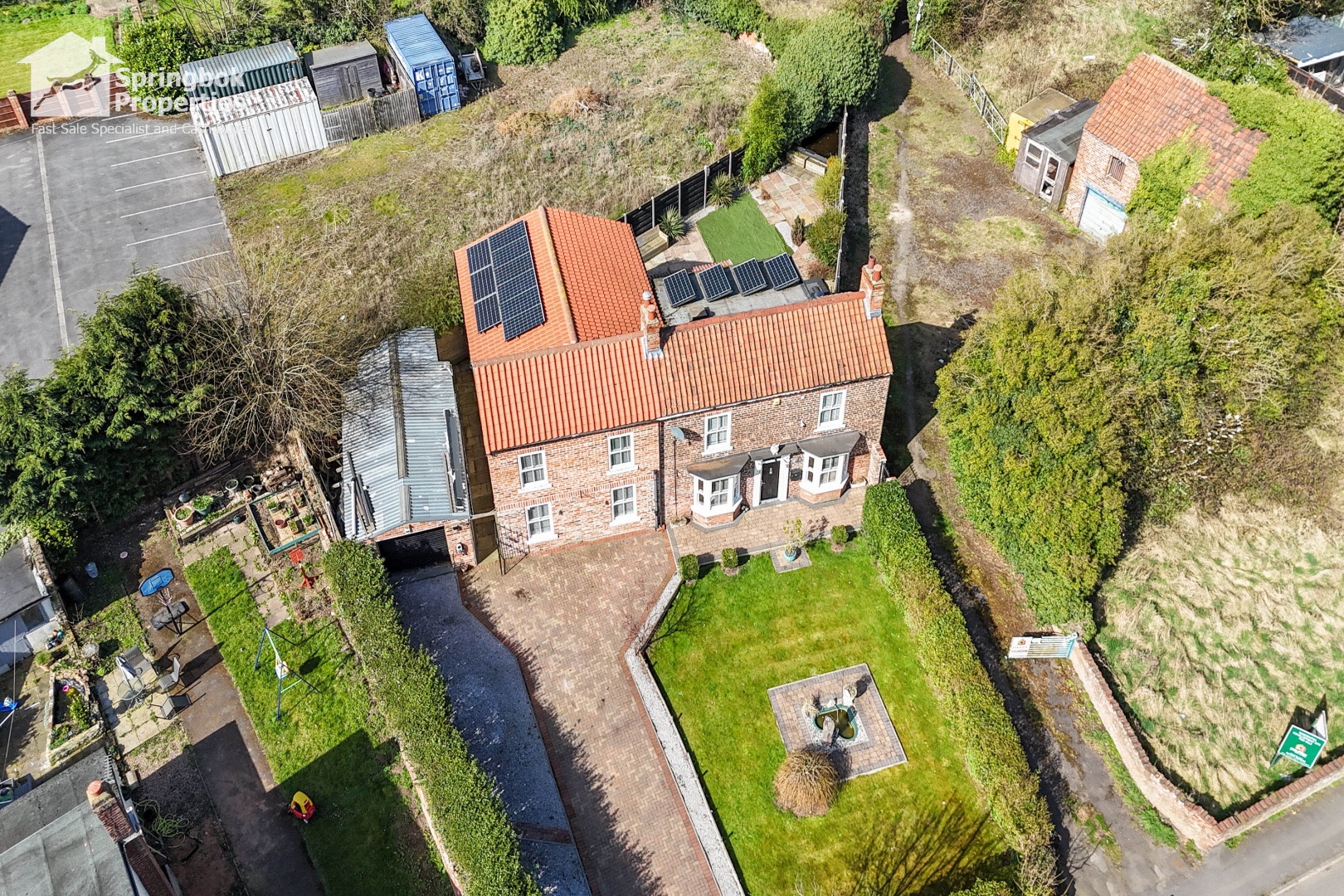 - Large gardens, partly laid to lawn, and partly paved